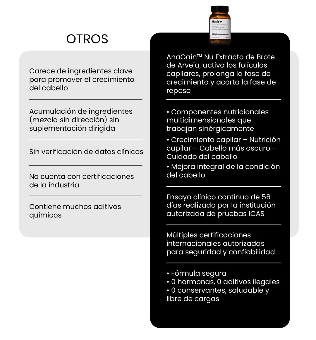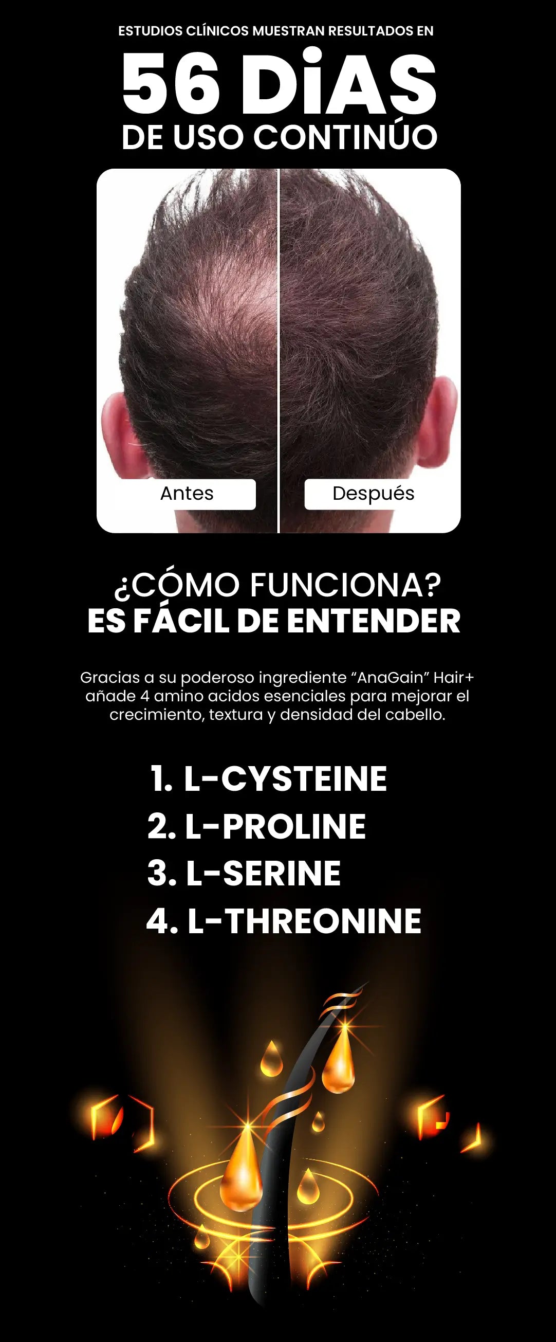Sí. AnaGain™ Nu, el ingrediente estrella, es un extracto de brote de arveja con evidencia clínica que sugiere que ayuda a reducir la caída y favorece fases saludables del ciclo capilar.